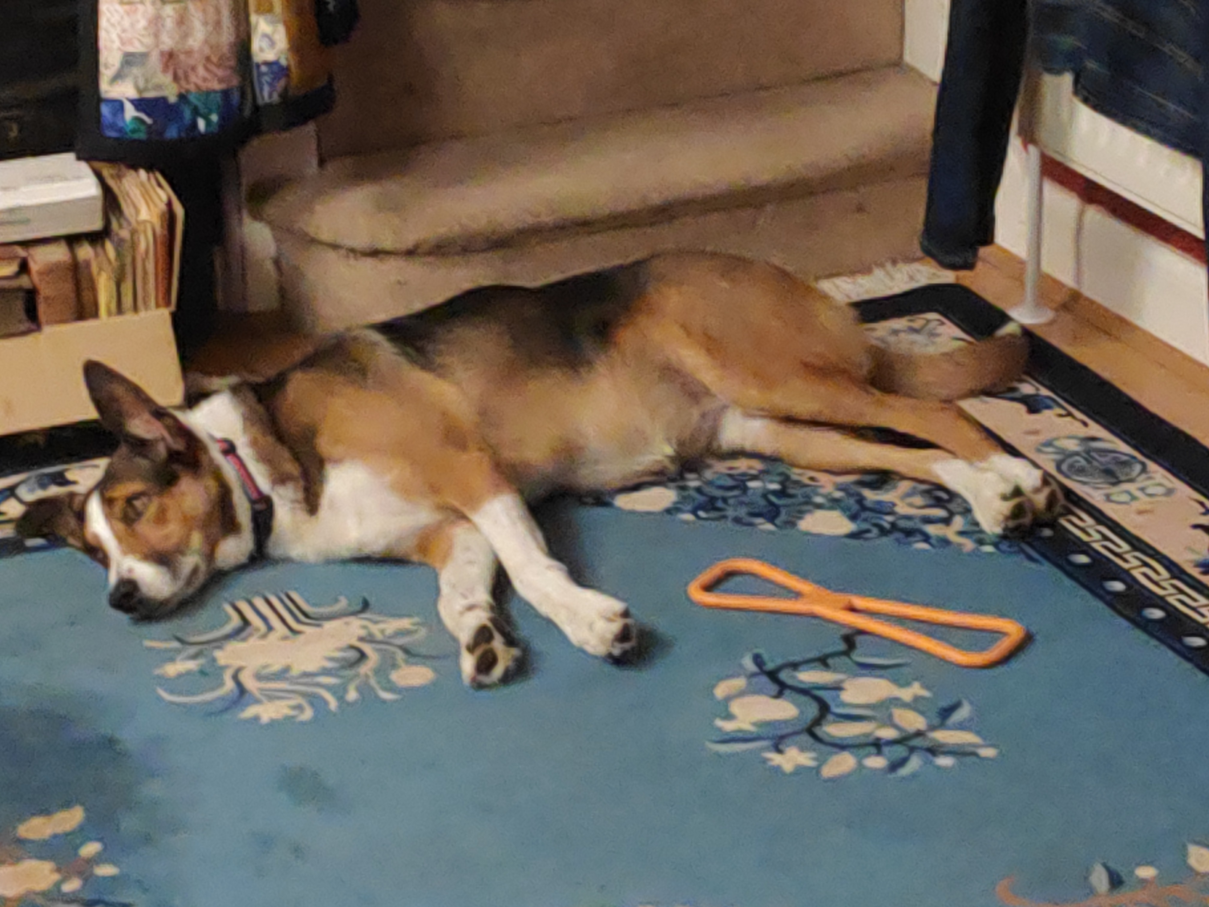 Meanwhile, I think I have broken the DDD; we got lost on a rainy walk and were out for a leeetle bit longer than intended, and she came home, ate all her supper without pausing to think, and is now lying flat on her side on the carpet with her eyes shut.