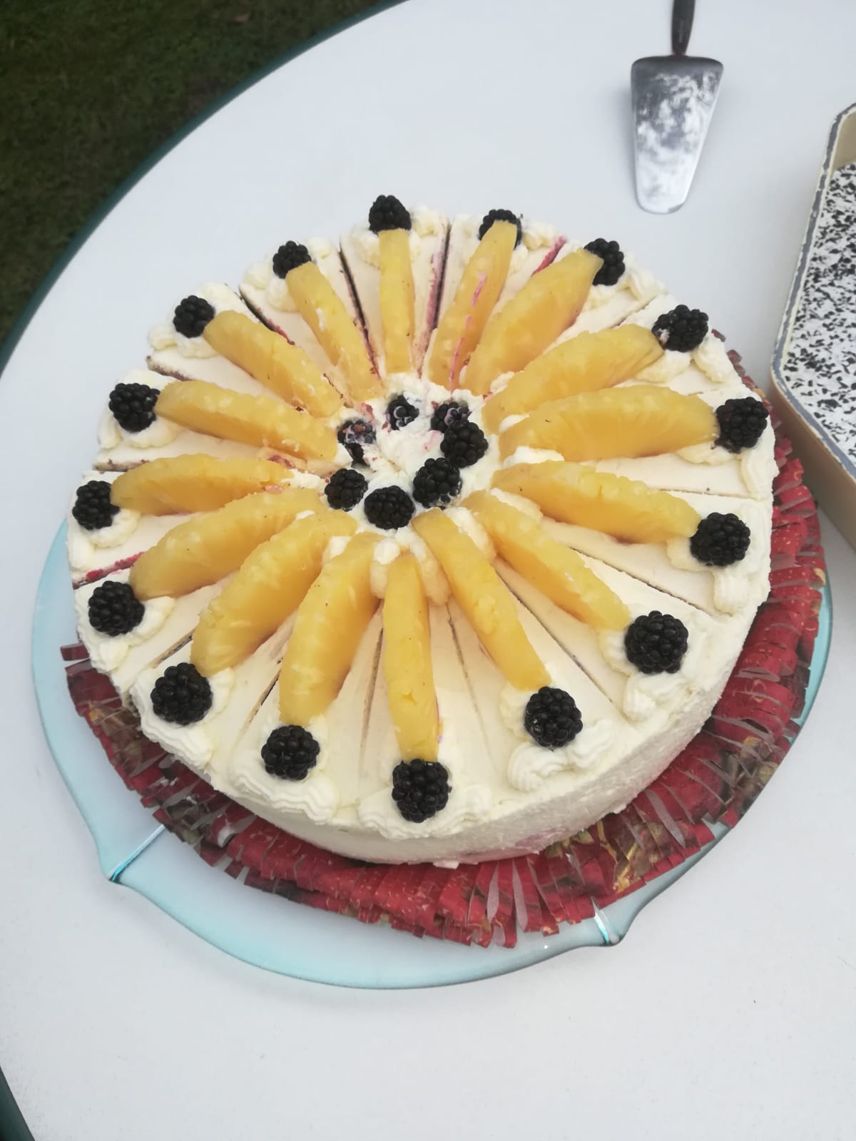 Fresh Blackberries, Pineapple, Blackcurrants, Redcurrants, Chocolate Cake, Cream & Yoghurt